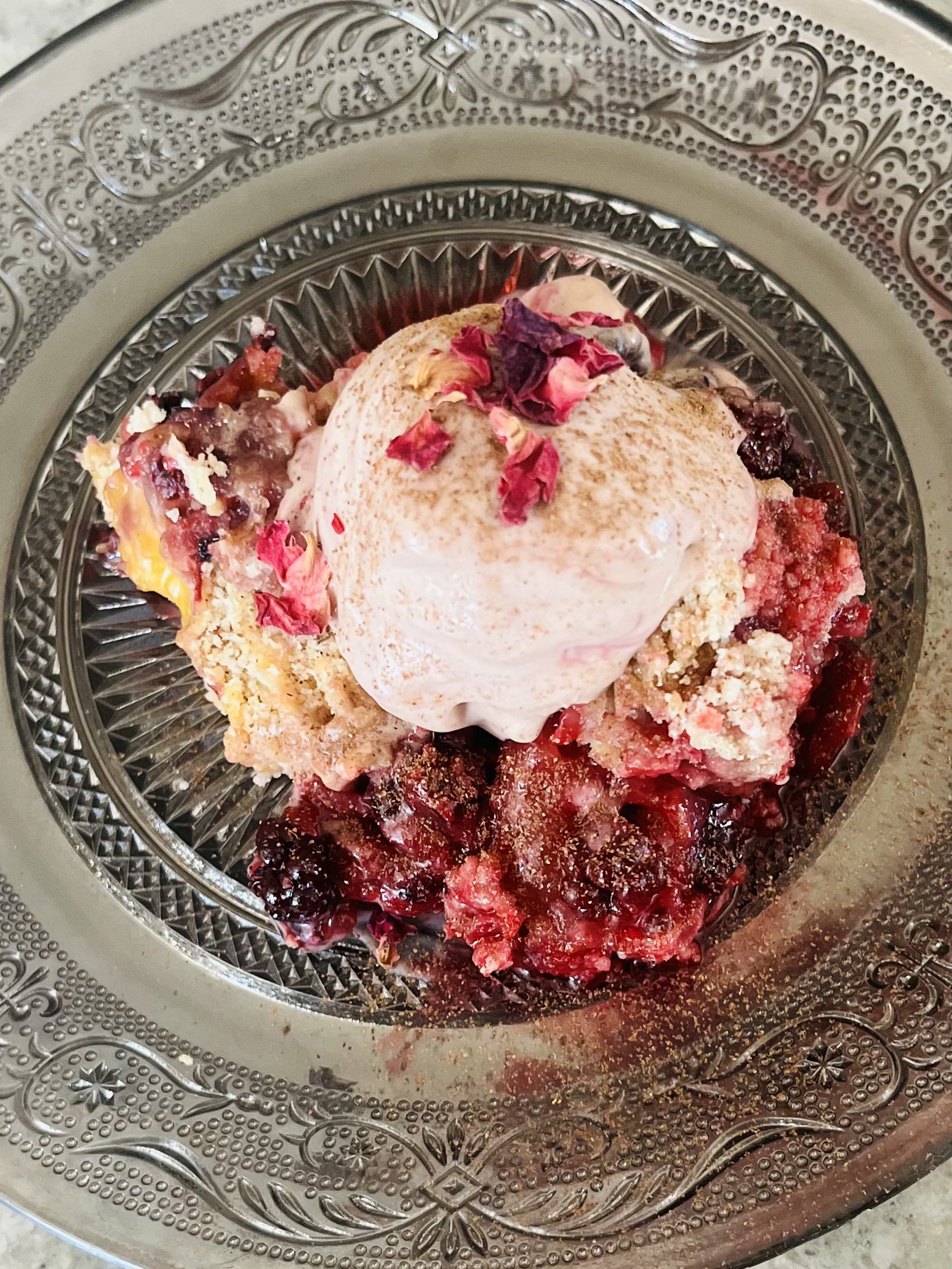 • A buttery blackberry crumble with spiced oats or roasted sticky figs with a drizzle of honey